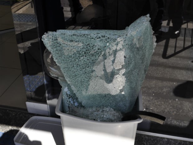 Funcionária gritou e ele fugiu sem levar nada, quebrando a porta giratória.